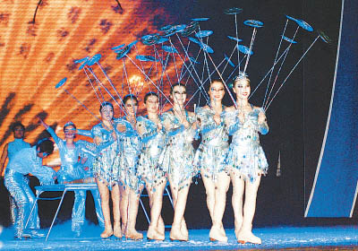 15日晚,黑龙江冰上杂技舞蹈团在哈尔滨市青年宫为参加“两会”的代表、委员们呈现了一场精彩的大型冰上特技舞蹈秀。 省领导栗战书、杜宇新、刘东辉、陈述涛、陶夏新和中华民族文化促进会主席高占祥同代表、委员们一同观看演出。
