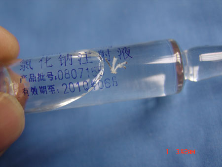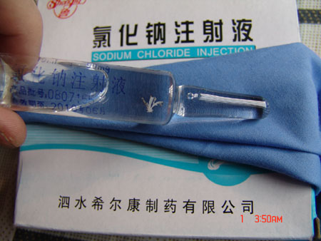 平顶山市新华区人民医院秦大夫向记者介绍说,2008年11月5日,他正在给患者进行特殊治疗时,发现注射用的0.9%氯化钠注射液内有较大异物且肉眼可见,形状约像一只蚊子(如图),该药品批号为0807165,生产厂家是山东省泗水希尔康制药有限公司。