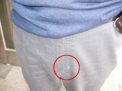喜欢穿名牌的辛先生,在哈尔滨市道理区十二道街的红博购物广场买了一件梦特娇牌的西裤,由于对梦特娇的信任和当时室内光线不够,辛先生没发现这个设计问题,交了钱就走了。可是回家一看,才发现在裤面拉锁位置,有一块印记明显的斑点,在阳光下很显眼,乍一看有点像“尿碱”。