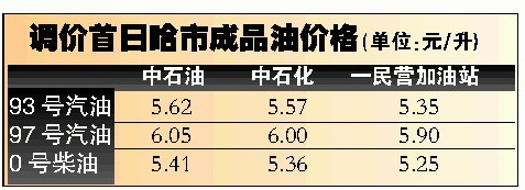 记者随后在道外区南直路上的一家民营加油站看到,93号汽油、97号汽油、0号柴油每升售价分别为5.50元、6.00元、5.50元。“民营加油站的成品油零售价向来都是跟着两大石油巨头的价格走。”据加油站一工作人员介绍,该站上午将93号、97号汽油和0号柴油均下调0.10元/升。