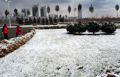 由于天气较冷,屋顶、草丛及许多汽车顶部留下的积雪一直未化。许多行驶中的汽车都顶着一顶“冰帽子”;路边的绿化带像盖了一层薄薄的白棉被。这是哈尔滨市第一场“站住”了的雪。