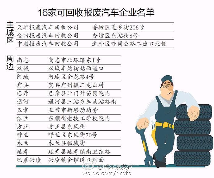 据微博@哈尔滨发布消息,近期,哈市将启动集中淘汰治理黄标车工作。为了配合此项工作的顺利开展,市商务局公布了全市报废汽车回收企业的经营地址等信息,方便黄标车车主、私家车车主联系企业报废车辆。目前,全市共有16家企业可以回收报废车辆,其中,3家具有拆解资质。 据微博@哈尔滨发布消息,近期,哈市将启动集中淘汰治理黄标车工作。为了配合此项工作的顺利开展,市商务局公布了全市报废汽车回收企业的经营地址等信息,方便黄标车车主、私家车车主联系企业报废车辆。目前,全市共有16家企业可以回收报废车辆,其中,3家具有拆解资质。