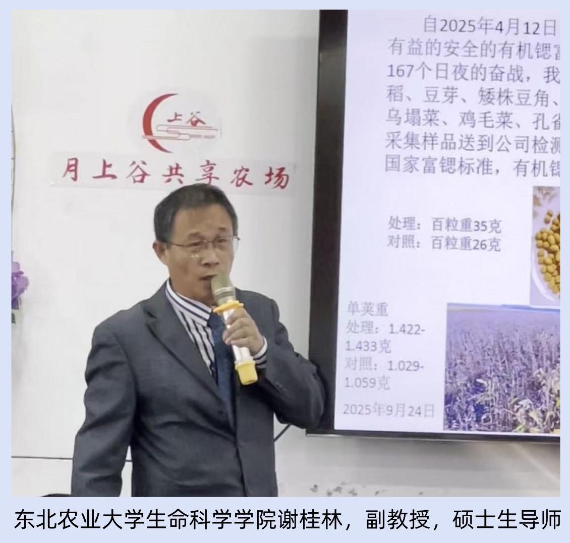 利用植物吸收转化形成的有机锶,更具有安全性,有关其具体作用机制,后续将是科技小院研发的重点。 启动仪式由合作企业组织,会上首席专家谢桂林教授以《科技赋能农业-振兴富锶乡村》为题,详细讲解了自审批通过以来开展的所有工作,并展示所有富锶科技成果。结果显示,利用农大技术,在拥有富偏硅酸锶矿泉水资源的东兴村实验基地所生产出来的作物、蔬菜和瓜果,锶含量均超过了国家富锶标准(≥0.2mg/L,GB8537-2018),尤其是豆类作物,最高可达16.2mg/kg,是国家富锶标准的81倍。从下图可以看出,大豆土壤浇灌富锶矿泉水、叶面喷施富锶叶面肥后,能明显看出其植株高于旁边未喷施富锶叶面肥的植株;用富锶大豆浸泡出来的豆芽,三天半的时间,可长成20多厘米的长度;秋豆角叶片出奇的大,其长度超过了20厘米。