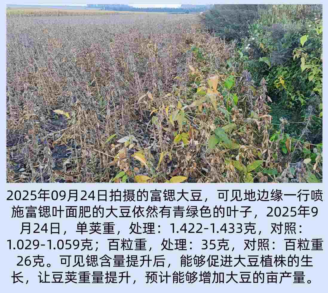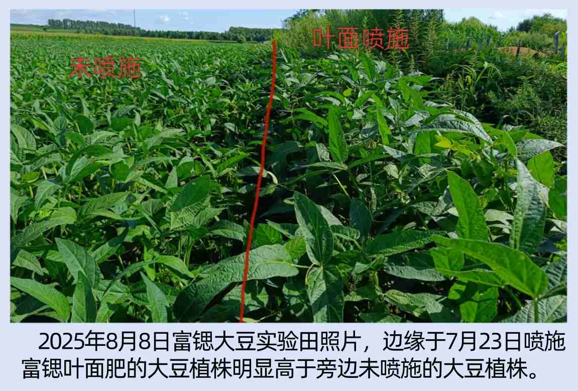 2025年8月8日富锶大豆实验田照片,边缘于7月23日喷施富锶叶面肥的大豆植株明显高于旁边未喷施的大豆植株。